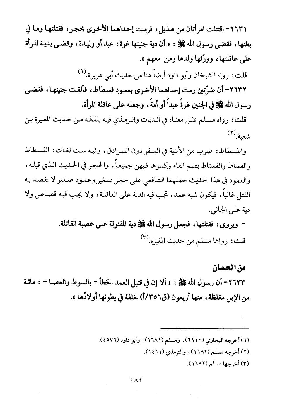 2632 - أن ضرّتين رمت إحداهما الأخرى بعمود فسطاط، فألقت جنينها، فقضى رسول الله - صلى الله عليه وسلم - في الجنين غرةً عبدًا أو أمةً، وجعله على عاقلة المرأة.