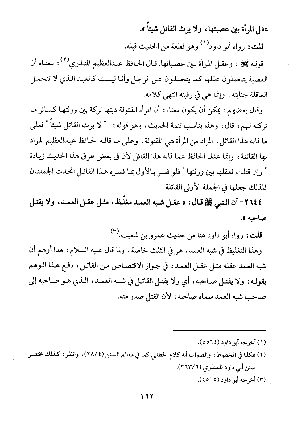 وقال بعضهم: يمكن أن يكون معناه: أن المرأة المقتولة ديتها تركة بين ورثتها كسائر ما تركته لهم، قال: وهذا يناسب تتمة الحديث، وهو قوله: "لا يرث القاتل شيئًا" فعلى ما قاله هذا القائل، المراد من المرأة هي المقتولة، وعلى ما قاله الحافظ عبد العظيم المراد بها القاتلة، وإنما عدل الحافظ عما قاله هذا القائل لأن في بعض طرق هذا الحديث زيادة "وإن قتلت فعقلها بين ورثتها" فلو فسر بالأول بما فسره هذا القائل اتحدت الجملتان فلذلك جعلها في الجملة الأولى القاتلة.