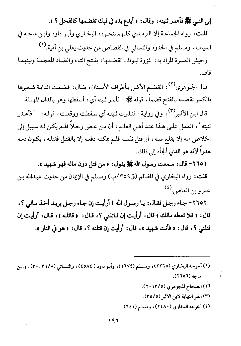 2652 - جاء رجل فقال: يا رسول الله! أرأيت إن جاء رجل يريد أخذ مالي؟، قال: "فلا تعطه مالك" قال: أرأيت إن قاتلني؟، قال: "قاتله"، قال: أرأيت إن قتلني؟، قال: "فأنت شهيد"، قال: أرأيت إن قتلته؟، قال: "هو في النار".