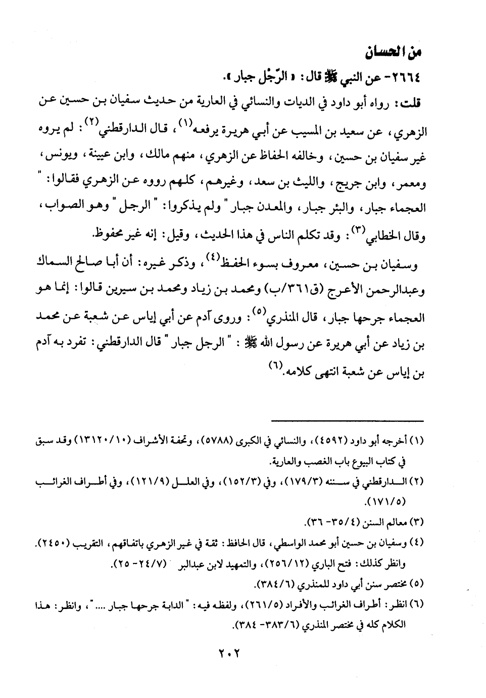 (¬6) انظر: أطراف الغرائب والأفراد (5/ 261)، ولفظه فيه: "الدابة جرحها جبار .... "، وانظر: هذا الكلام كله في مختصر المنذري (6/ 383 - 384).