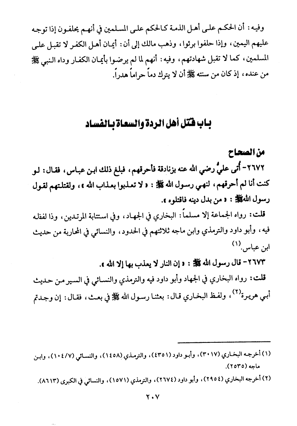 2672 - أُتى عليّ رضي الله عنه بزنادقة فأحرقهم، فبلغ ذلك ابن عباس، فقال: لو كنت أنا لم أحرقهم، لنهي رسول الله - صلى الله عليه وسلم -: "لا تعذبوا بعذاب الله"، ولقتلتهم لقول رسول الله - صلى الله عليه وسلم -: "من بدل دينه فاقتلوه".