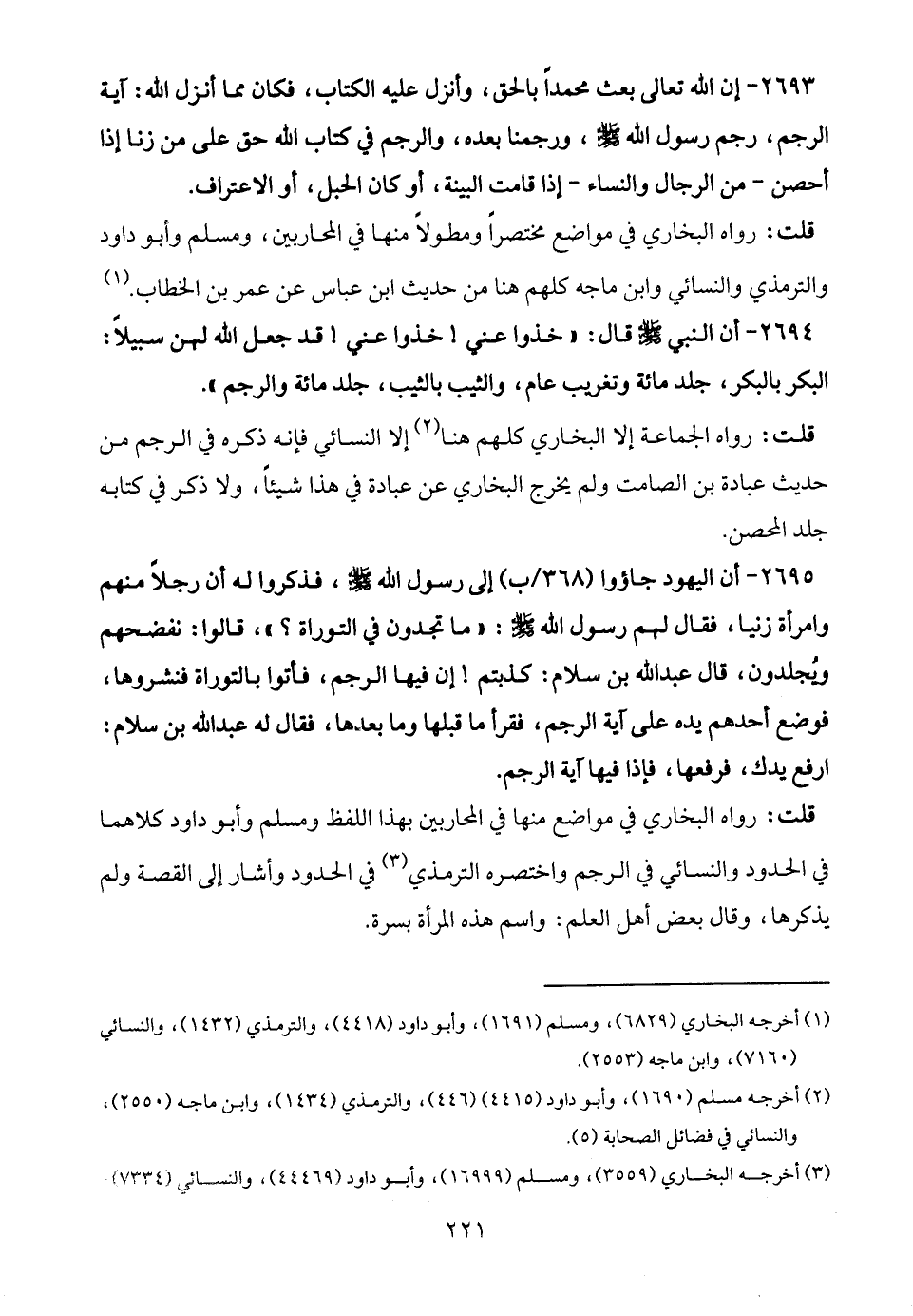 2695 - أن اليهود جاؤوا إلى رسول الله - صلى الله عليه وسلم -، فذكروا له أن رجلًا منهم وامرأة زنيا، فقال لهم رسول الله - صلى الله عليه وسلم -: "ما تجدون في التوراة؟ "، قالوا: نفضحهم ويُجلدون، قال عبد الله بن سلام: كذبتم! إن فيها الرجم، فأتوا بالتوراة فنشروها، فوضع أحدهم يده على آية الرجم، فقرأ ما قبلها وما بعدها، فقال له عبد الله بن سلام: ارفع يدك، فرفعها، فإذا فيها آية الرجم.