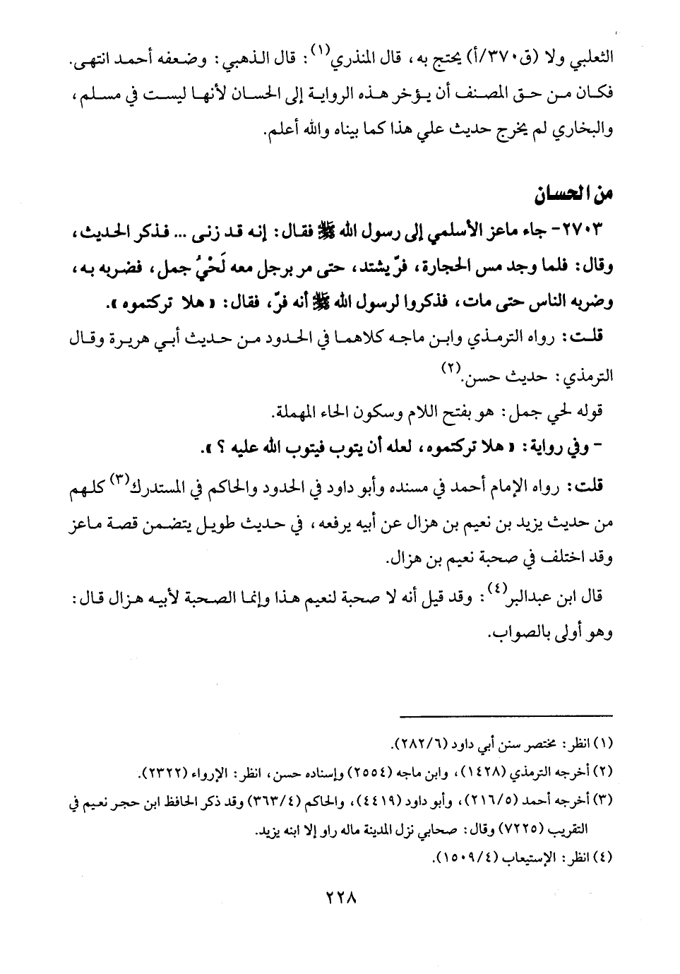 (¬3) أخرجه أحمد (5/ 216)، وأبو داود (4419)، والحاكم (4/ 363) وقد ذكر الحافظ ابن حجر نعيم في التقريب (7225) وقال: صحابي نزل المدينة ما له راو إلا ابنه يزيد.