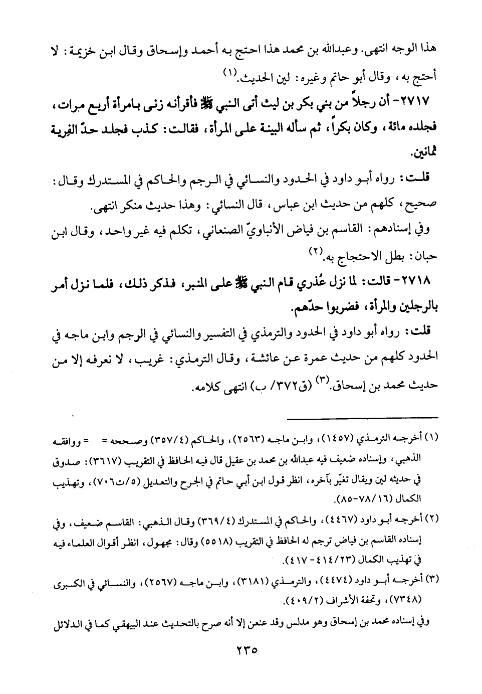 قلت: رواه أبو داود في الحدود والترمذي في التفسير والنسائي في الرجم وابن ماجه في الحدود كلهم من حديث عمرة عن عائشة، وقال الترمذي: غريب، لا نعرفه إلا من حديث محمد بن إسحاق. (¬3) انتهى كلامه.