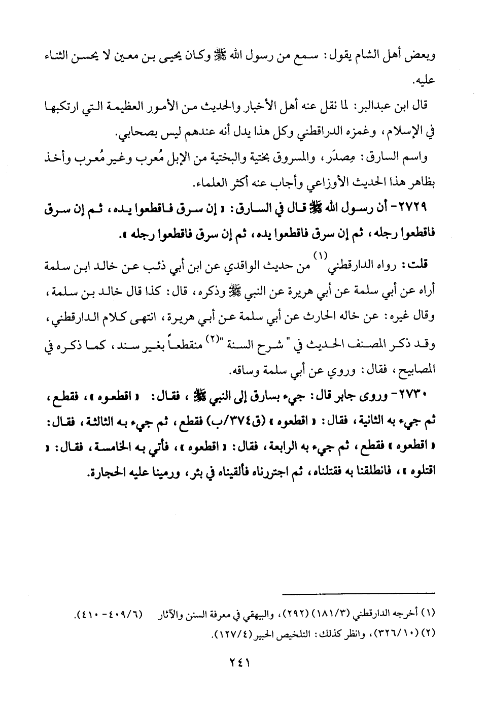 2730 - وروى جابر قال: جيء بسارق إلى النبي - صلى الله عليه وسلم -، فقال: "اقطعوه"، فقطع، ثم جيء به الثانية، فقال: "اقطعوه" فقطع، ثم جيء به الثالثة، فقال: "اقطعوه" فقطع، ثم جيء به الرابعة، فقال: "اقطعوه"، فأتي به الخامسة، فقال: "اقتلوه"، فانطلقنا به فقتلناه، ثم اجتررناه فألقيناه في بئر، ورمينا عليه الحجارة.