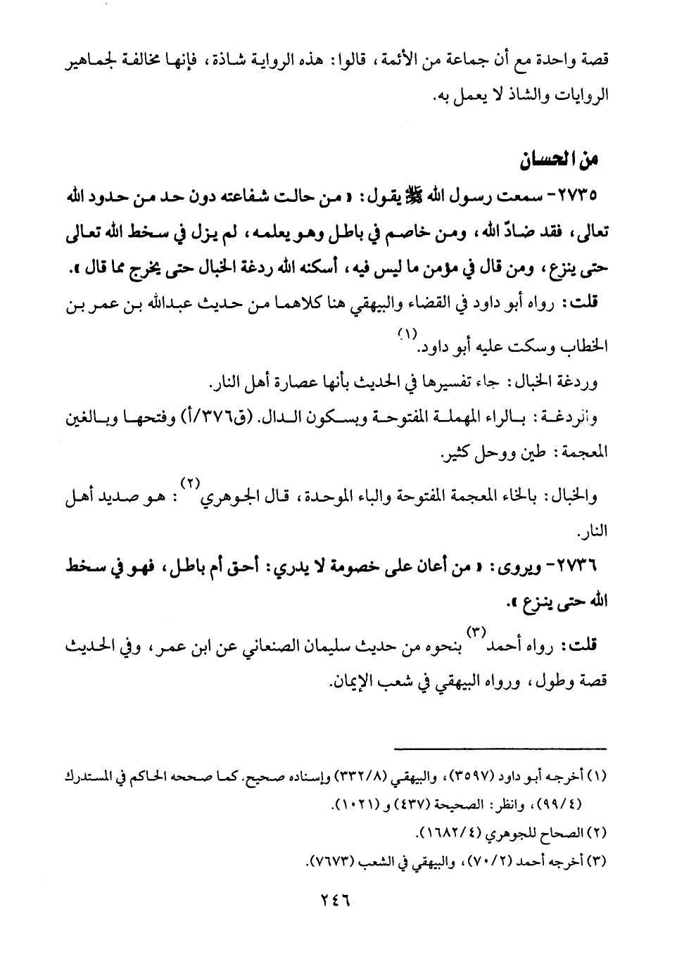 2735 - سمعت رسول الله - صلى الله عليه وسلم - يقول: "من حالت شفاعته دون حد من حدود الله تعالى، فقد ضادّ الله، ومن خاصم في باطل وهو يعلمه، لم يزل في سخط الله تعالى حتى ينزع، ومن قال في مؤمن ما ليس فيه، أسكنه الله ردغة الخبال حتى يخرج مما قال".