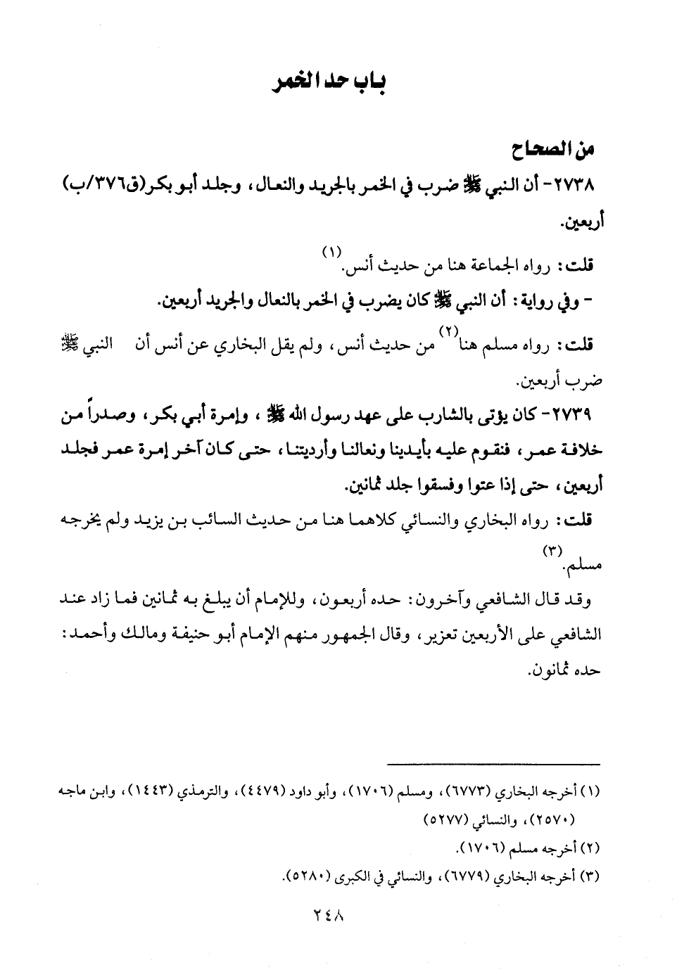 2739 - كان يؤتى بالشارب على عهد رسول الله - صلى الله عليه وسلم -، وإمرة أبي بكر، وصدرًا من خلافة عمر، فنقوم عليه بأيدينا ونعالنا وأرديتنا، حتى كان آخر إمرة عمر فجلد أربعين، حتى إذا عتوا وفسقوا جلد ثمانين.