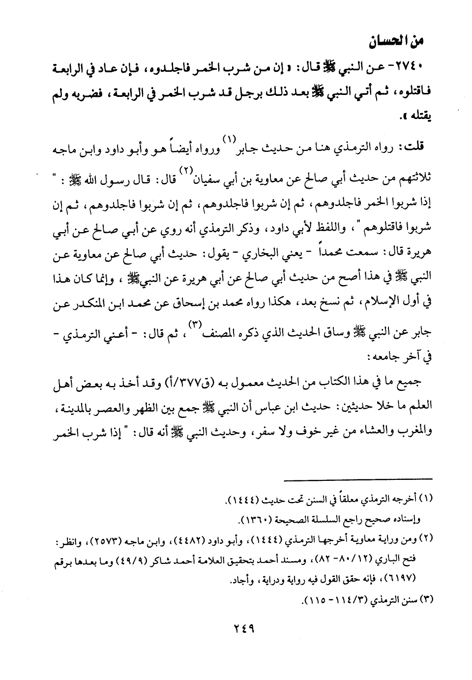 2740 - عن النبي - صلى الله عليه وسلم - قال: "إن من شرب الخمر فاجلدوه، فإن عاد في الرابعة فاقتلوه، ثم أتي النبي - صلى الله عليه وسلم - بعد ذلك برجل قد شرب الخمر في الرابعة، فضربه ولم يقتله".