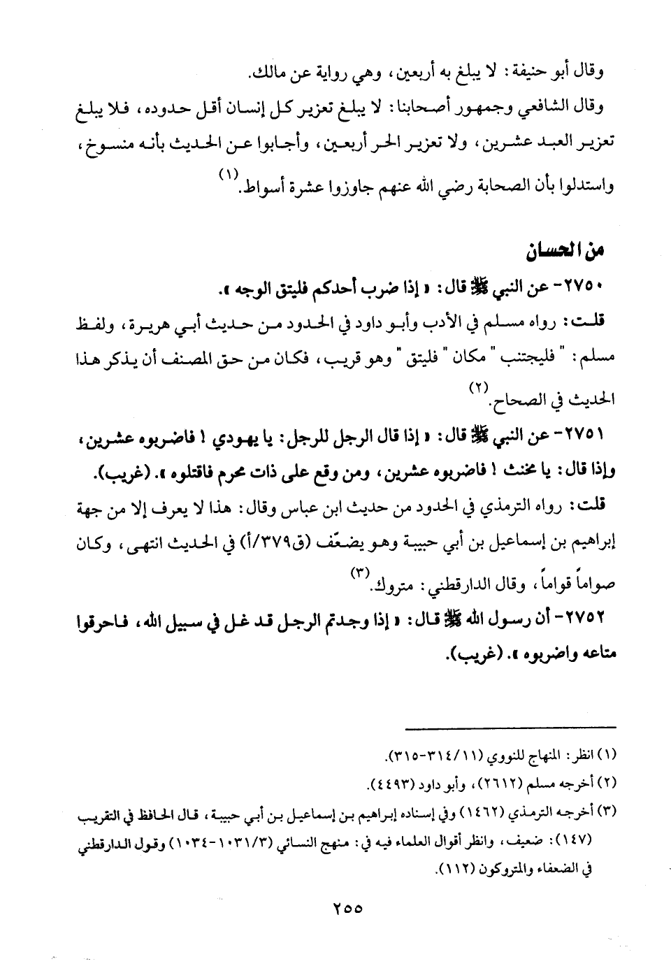 وقال الشافعي وجمهور أصحابنا: لا يبلغ تعزير كل إنسان أقل حدوده، فلا يبلغ تعزير العبد عشرين، ولا تعزير الحر أربعين، وأجابوا عن الحديث بأنه منسوخ، واستدلوا بأن الصحابة رضي الله عنهم جاوزوا عشرة أسواط. (¬1)