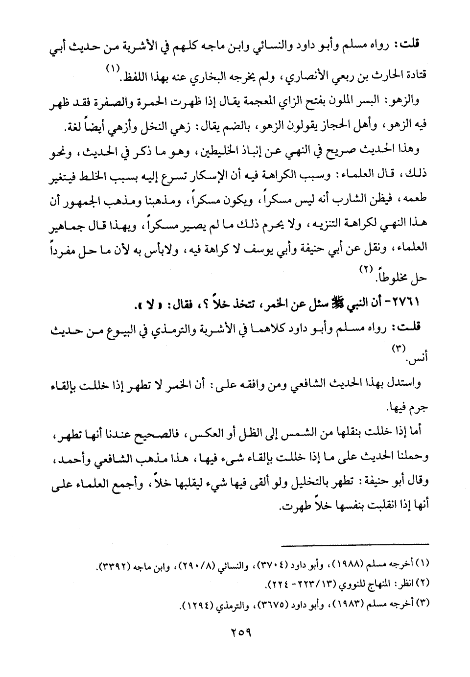 واستدل بهذا الحديث الشافعي ومن وافقه على: أن الخمر لا تطهر إذا خللت بإلقاء جرم فيها.