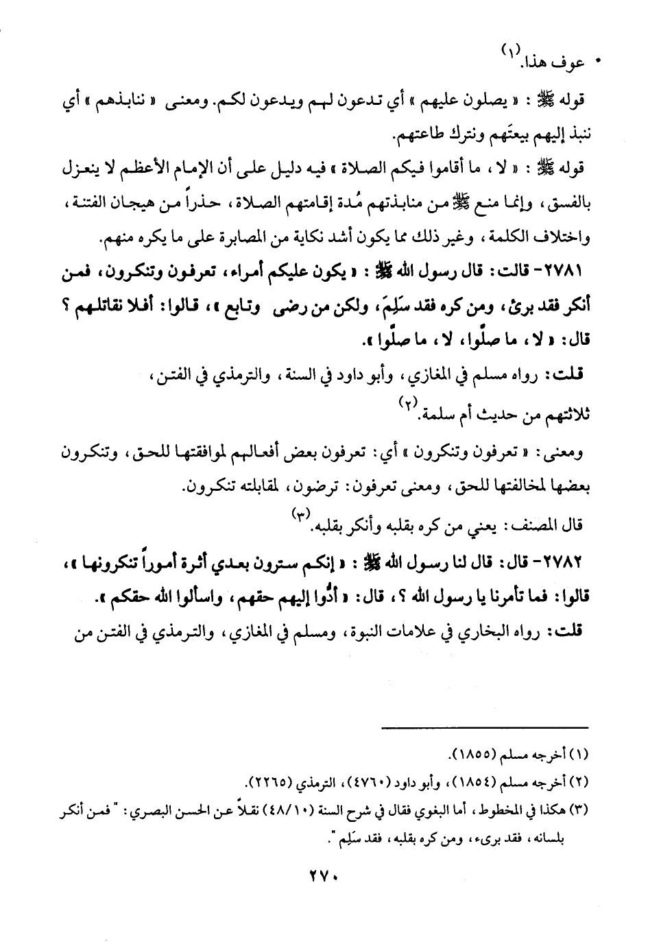 2781 - قالت: قال رسول الله - صلى الله عليه وسلم -: "يكون عليكم أمراء، تعرفون وتنكرون، فمن أنكر فقد برئ، ومن كره فقد سَلِمَ، ولكن من رضي وتابع"، قالوا: أفلا نقاتلهم؟ قال: "لا، ما صلوا، لا، ما صلوا".