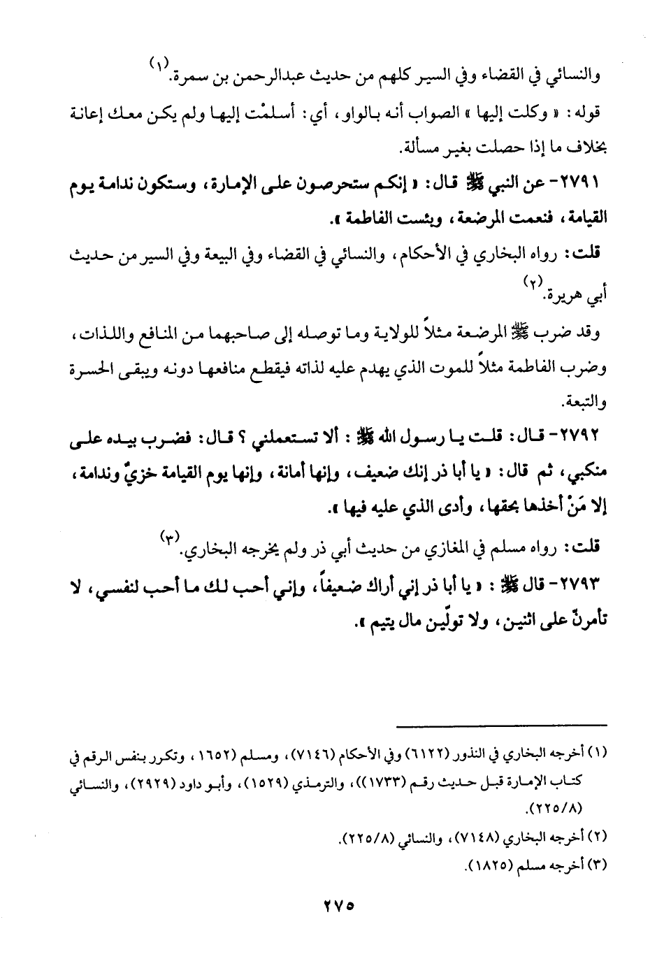 2792 - قال: قلت يا رسول الله - صلى الله عليه وسلم -: ألا تستعملني؟ قال: فضرب بيده على منكبي، ثم قال: "يا أبا ذر إنك ضعيف، وإنها أمانة، وإنها يوم القيامة خزي وندامة، إلا مَنْ أخذها بحقها، وأدى الذي عليه فيها".