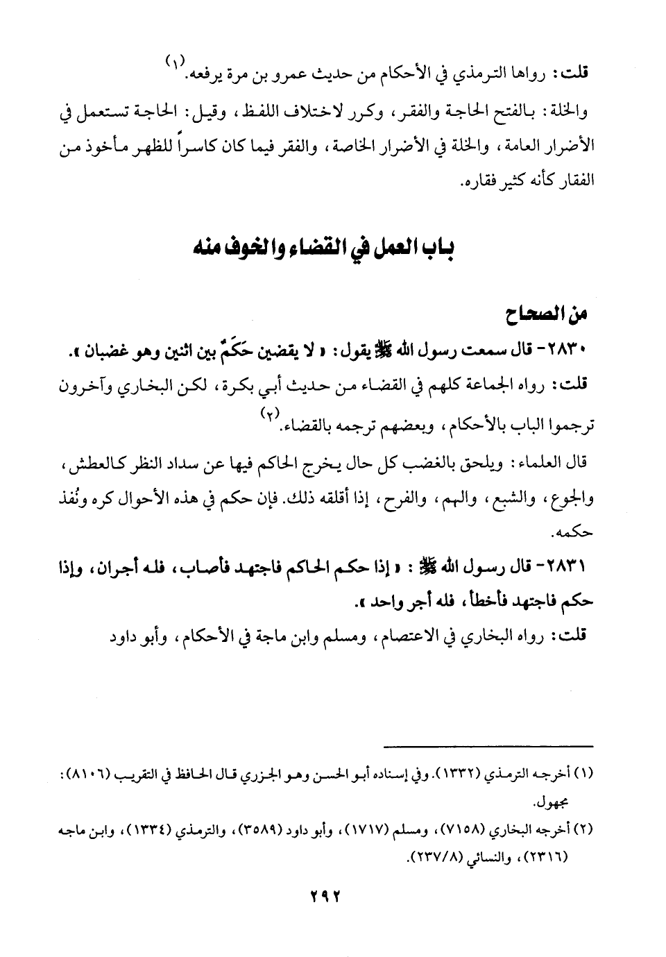 2831 - قال رسول الله - صلى الله عليه وسلم -: "إذا حكم الحاكم فاجتهد فأصاب، فله أجران، وإذا حكم فاجتهد فأخطأ، فله أجر واحد".