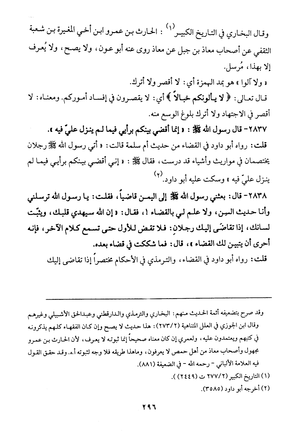 = وقد صرح بتضعيفه أئمة الحديث منهم: البخاري والترمذي والدارقطني وعبد الحق الأشبيلي وغيرهم وقال ابن الجوزي في العلل المتناهية (2/ 273): هذا حديث لا يصح وإن كان الفقهاء كلهم يذكرونه في كتبهم ويعتمدون عليه، ولعمري إن كان معناه صحيحًا إنما ثبوته لا يعرف؛ لأن الحارث بن عمرو مجهول وأصحاب معاذ من أهل حمص لا يعرفون، وما هذا طريقه فلا وجه لثبوته أ. .هـ وقد حقق القول فيه العلامة الألباني - رحمه الله - في الضعيفة (881).