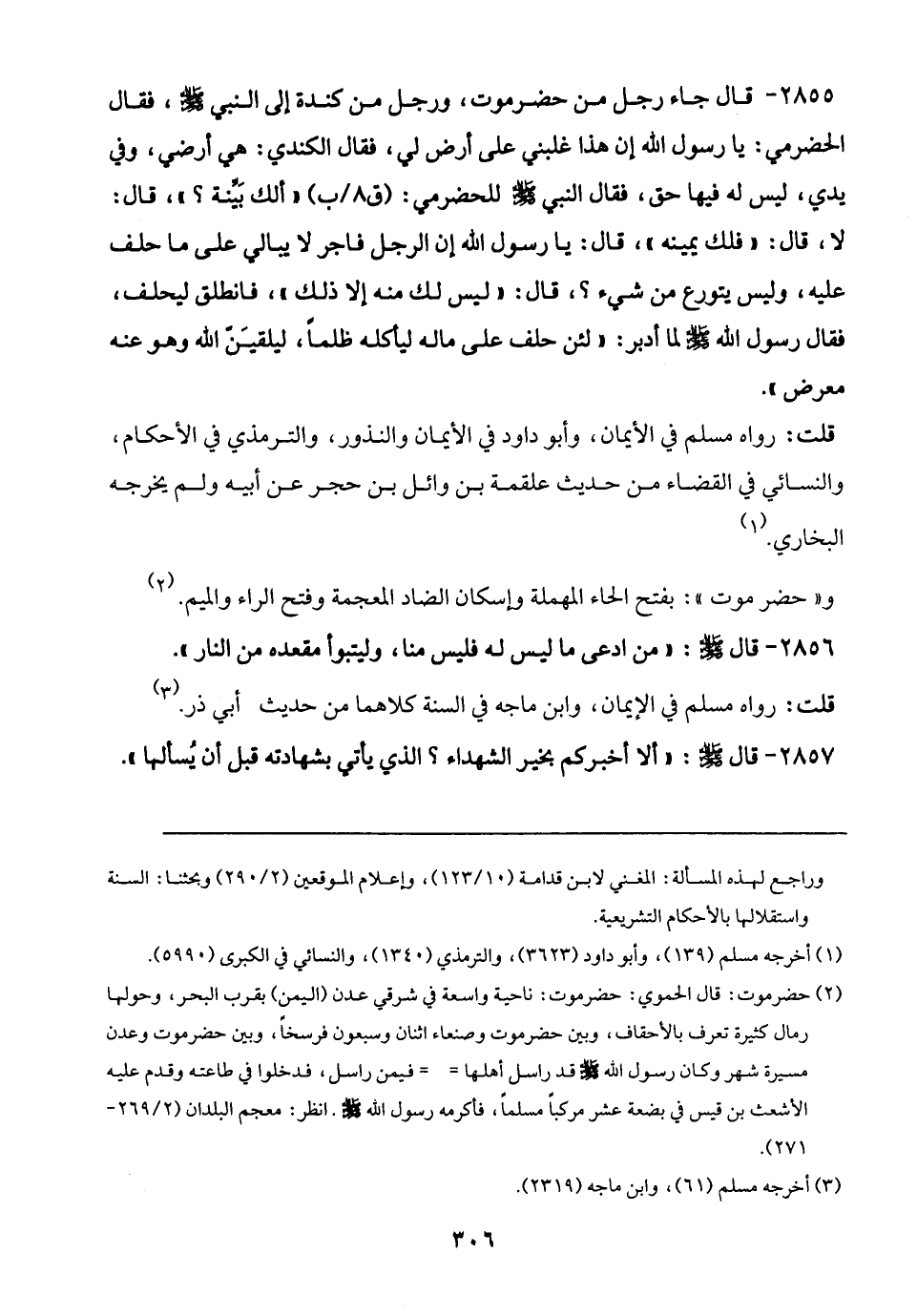 2855 - قال جاء رجل من حضرموت، ورجل من كندة إلى النبي - صلى الله عليه وسلم -، فقال الحضرمي: يا رسول الله إن هذا غلبني على أرض لي، فقال الكندي: هي أرضي، وفي يدي، ليس له فيها حق، فقال النبي - صلى الله عليه وسلم - للحضرمي: "ألك بَيِّنة؟ "، قال: لا، قال: "فلك يمينه"، قال: يا رسول الله إن الرجل فاجر لا يبالي على ما حلف عليه، وليس يتورع من شيء؟، قال: "ليس لك منه إلا ذلك"، فانطلق ليحلف، فقال رسول الله - صلى الله عليه وسلم - لما أدبر: "لئن حلف على ماله ليأكله ظلمًا، ليلقيَنّ الله وهو عنه معرض".