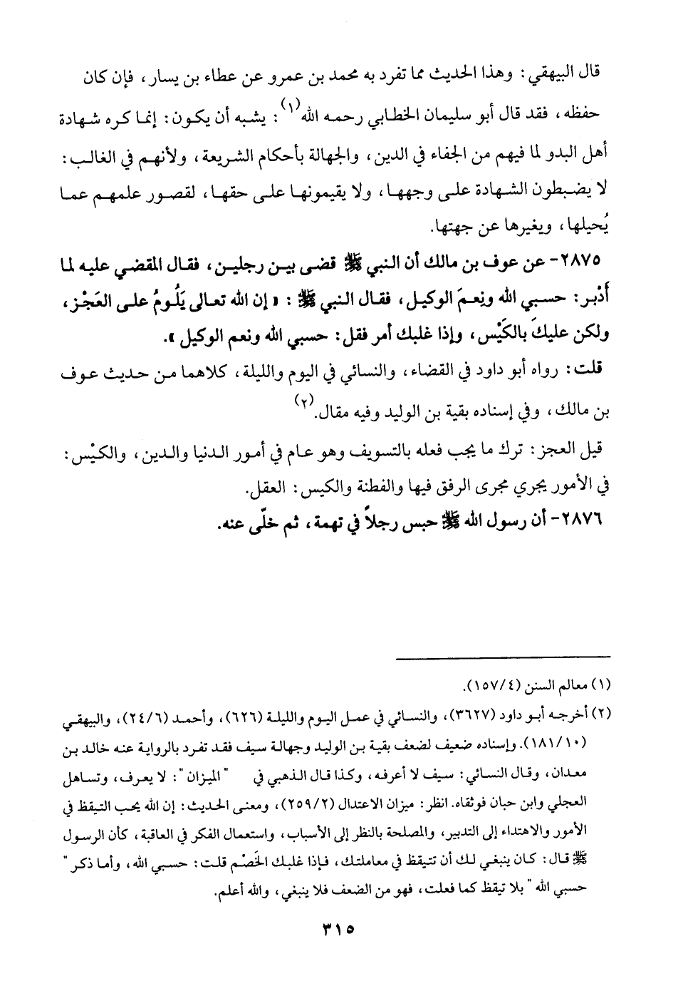 2875 - عن عوف بن مالك أن النبي - صلى الله عليه وسلم - قضى بين رجلين، فقال المقضي عليه لما أدبر: حسبي الله ونِعمَ الوكيل، فقال النبي - صلى الله عليه وسلم -: "إن الله تعالى يَلُومُ على العَجْز، ولكن عليكَ بالكَيْس، وإذا غلبك أمر فقل: حسبي الله ونعم الوكيل".