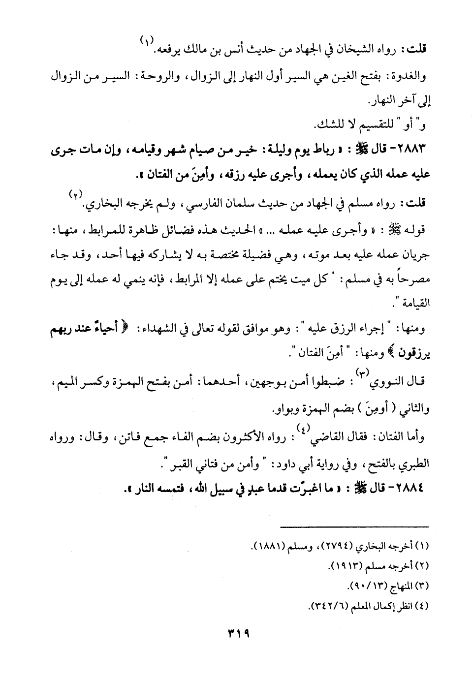 2883 - قال - صلى الله عليه وسلم -: "رباط يوم وليلة: خير من صيام شهر وقيامه، وإن مات جرى عليه عمله الذي كان يعمله، وأجرى عليه رزقه، وأمِنَ من الفتان".
