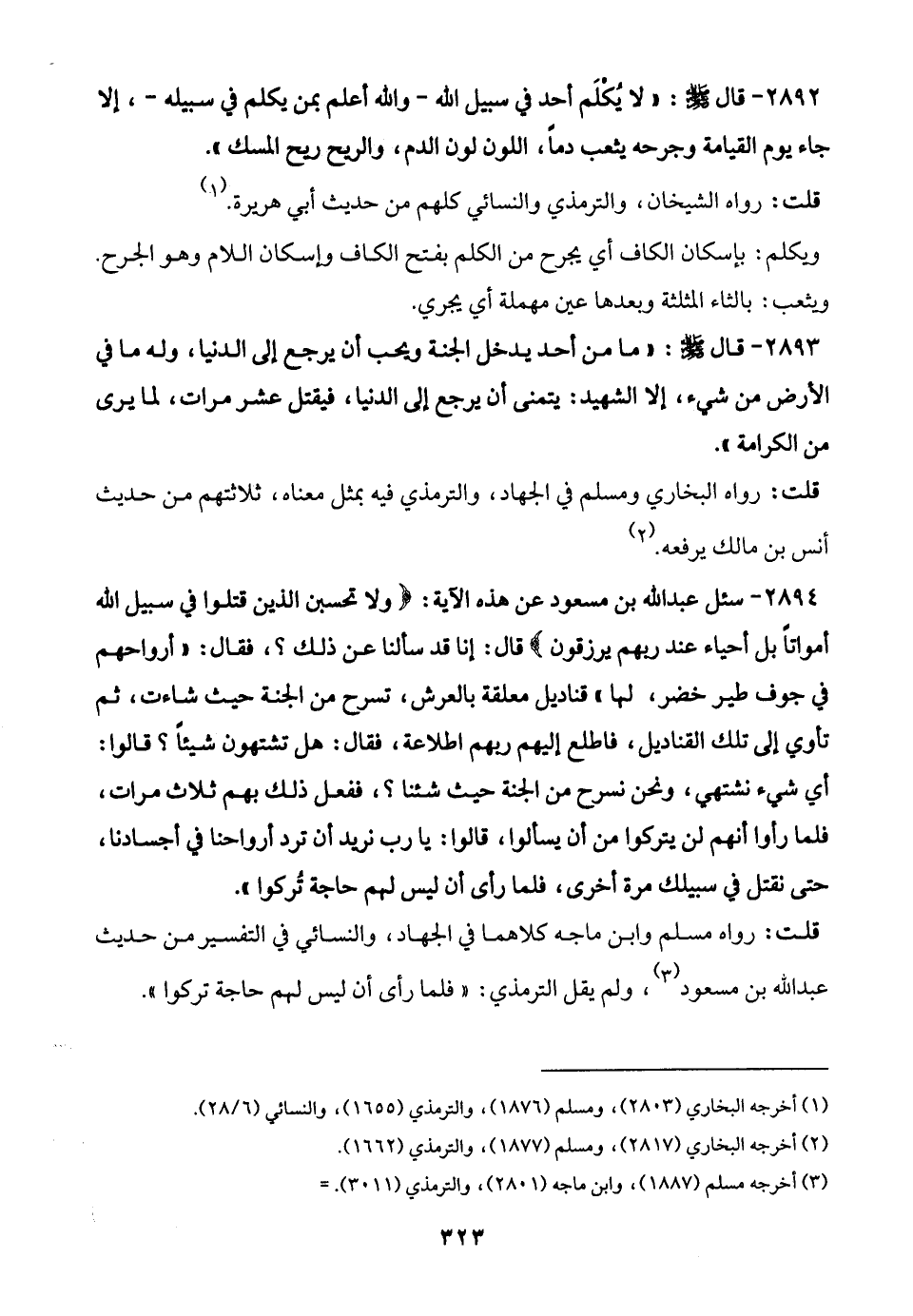 2894 - سئل عبد الله بن مسعود عن هذه الآية: {وَلَا تَحْسَبَنَّ الَّذِينَ قُتِلُوا فِي سَبِيلِ اللَّهِ أَمْوَاتًا بَلْ أَحْيَاءٌ عِنْدَ رَبِّهِمْ يُرْزَقُونَ} قال: إنا قد سألنا عن ذلك؟، فقال: "أرواحهم في جوف طير خضر، لها" قناديل معلقة بالعرش، تسرح من الجنة حيث شاءت، ثم تأوي إلى تلك القناديل، فاطلع إليهم ربهم اطلاعة، فقال: هل تشتهون شيئًا؟ قالوا: أي شيء نشتهي، ونحن نسرح من الجنة حيث شئنا؟، ففعل ذلك بهم ثلاث مرات، فلما رأوا أنهم لن يتركوا من أن يسألوا، قالوا: يا رب نريد أن ترد أرواحنا في أجسادنا، حتى نقتل في سبيلك مرة أخرى، فلما رأى أن ليس لهم حاجة تُركوا".