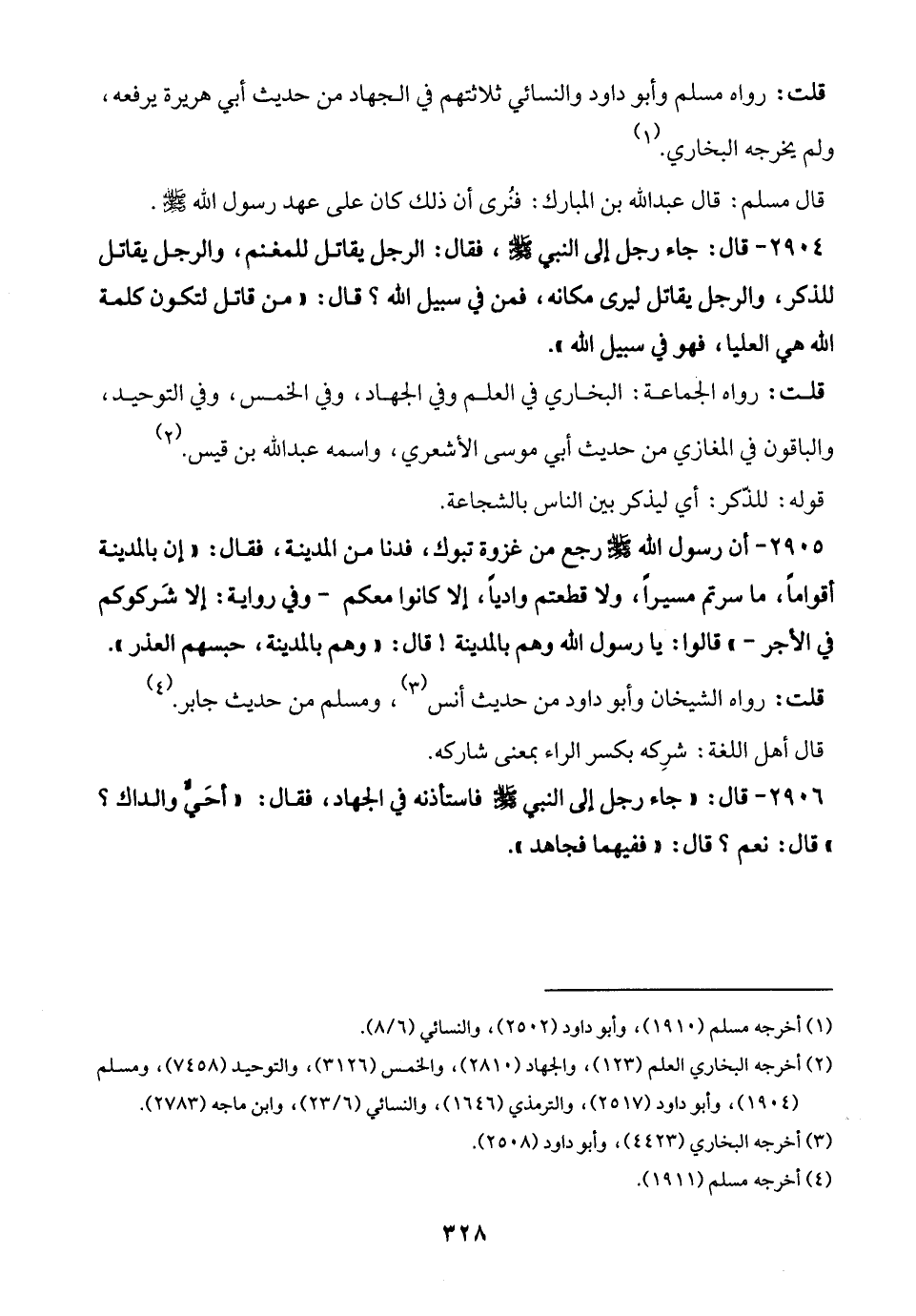 2904 - قال: جاء رجل إلى النبي - صلى الله عليه وسلم -، فقال: الرجل يقاتل للمغنم، والرجل يقاتل للذكر، والرجل يقاتل ليرى مكانه، فمن في سبيل الله؟ قال: "من قاتل لتكون كلمة الله هي العليا، فهو في سبيل الله".