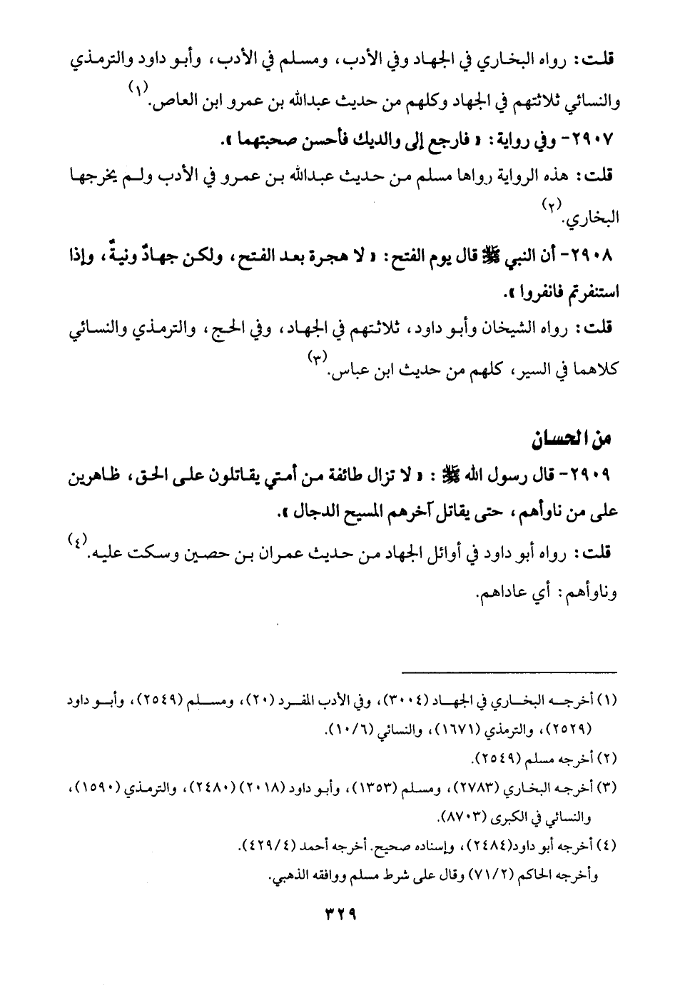 قلت: رواه البخاري في الجهاد وفي الأدب، ومسلم في الأدب، وأبو داود والترمذي والنسائي ثلاثتهم في الجهاد وكلهم من حديث عبد الله بن عمرو ابن العاص. (¬1)