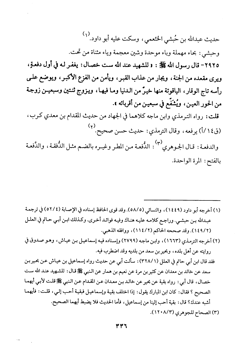 قلت: رواه الترمذي وابن ماجه كلاهما في الجهاد من حديث المقدام بن معدي كرب، يرفعه، وقال الترمذي: حديث حسن صحيح. (¬2)