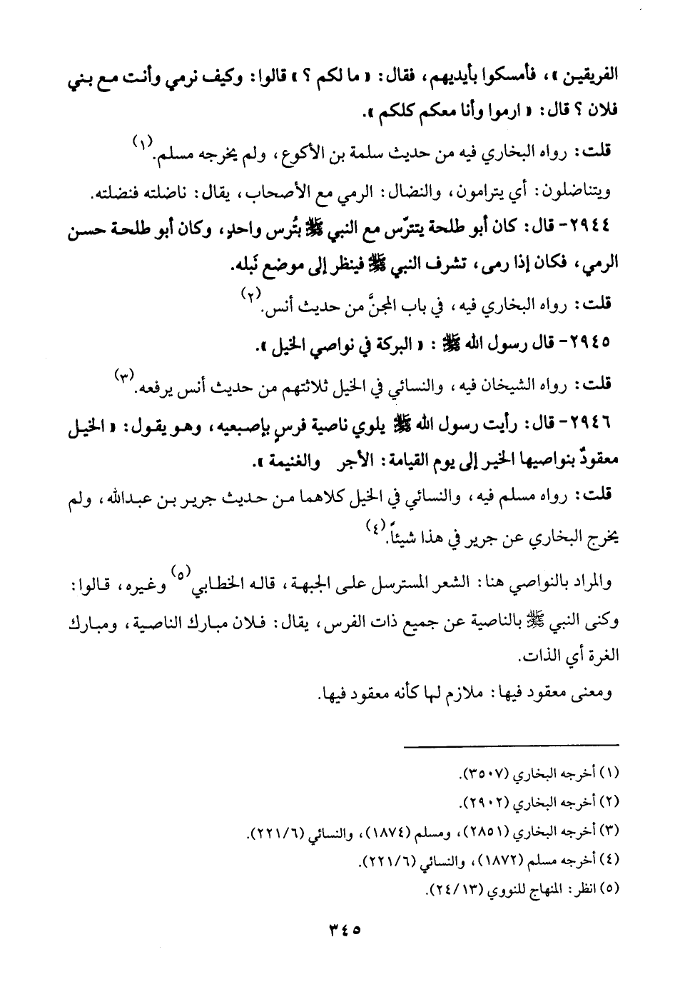 قلت: رواه مسلم فيه، والنسائي في الخيل كلاهما من حديث جرير بن عبد الله، ولم يخرج البخاري عن جرير في هذا شيئًا. (¬4)