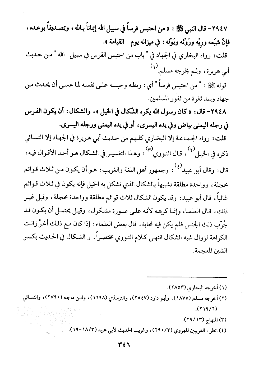 2948 - قال: "كان رسول الله يكره الشّكال في الخيل"، والشكال: أن يكون الفرس في رجله اليمنى بياض وفي يده اليسرى، أو في يده اليمنى ورجله اليسرى.