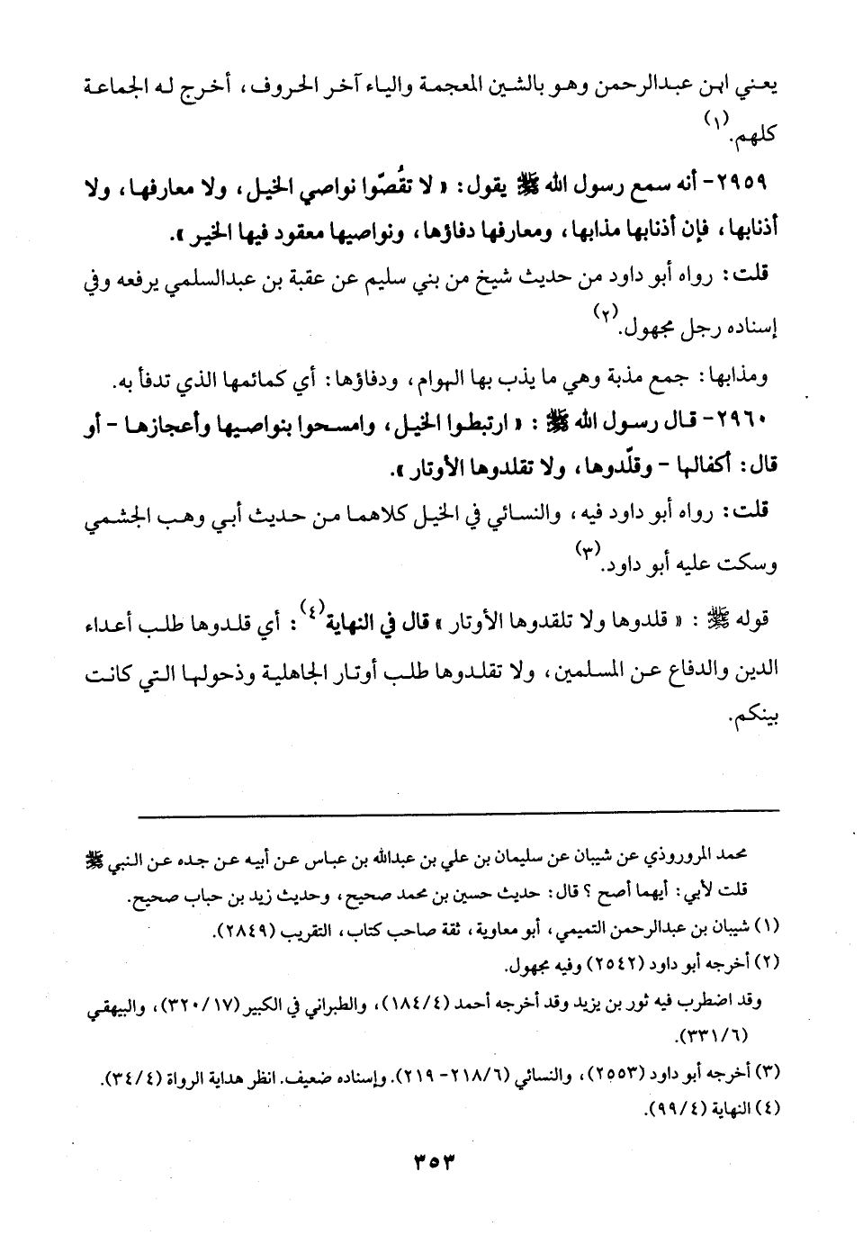 2959 - أنه سمع رسول الله - صلى الله عليه وسلم - يقول: "لا تقُصّوا نواصي الخيل، ولا معارفها, ولا أذنابها، فإن أذنابها مذابها، ومعارفها دفاؤها، ونواصيها معقود فيها الخير".