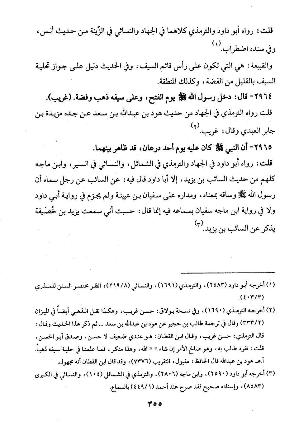 (¬2) أخرجه الترمذي (1690)، وفي نسخة بولاق: حسن غريب، وهكذا نقل الذهبي أيضًا في الميزان (2/ 333) وقال في ترجمة طالب بن حجير عن هود بن عبد الله بن سعد ... ثم ذكر هذا الحديث وقال: قال الترمذي: حسن غريب، وقال ابن القطان: هو عندي ضعيف لا حسن، وصدق أبو الحسن، قلت: تفرد طالب به، وهو صالح الأمر إن شاء = = الله، وهذا منكر، فما علمنا في حلية سيفه ذهبًا. أ. هـ. هود بن عبد الله قال الحافظ: مقبول، التقريب (7376)، وقد قال ابن القطان أنه مجهول.