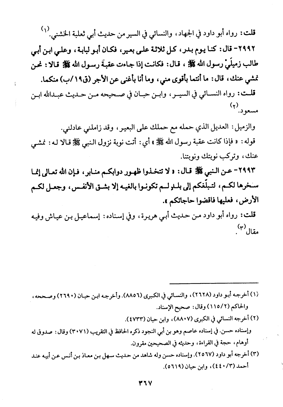 2992 - قال: كنا يوم بدر، كل ثلاثة على بعير، فكان أبو لبابة، وعلي بن أبي طالب زميلَيْ رسول الله - صلى الله عليه وسلم -، قال: فكانت إذا جاءت عقبة رسول الله - صلى الله عليه وسلم - قالا: نحن نمشي عنك، قال: ما أنتما بأقوى مني، وما أنا بأغنى عن الأجر منكما.