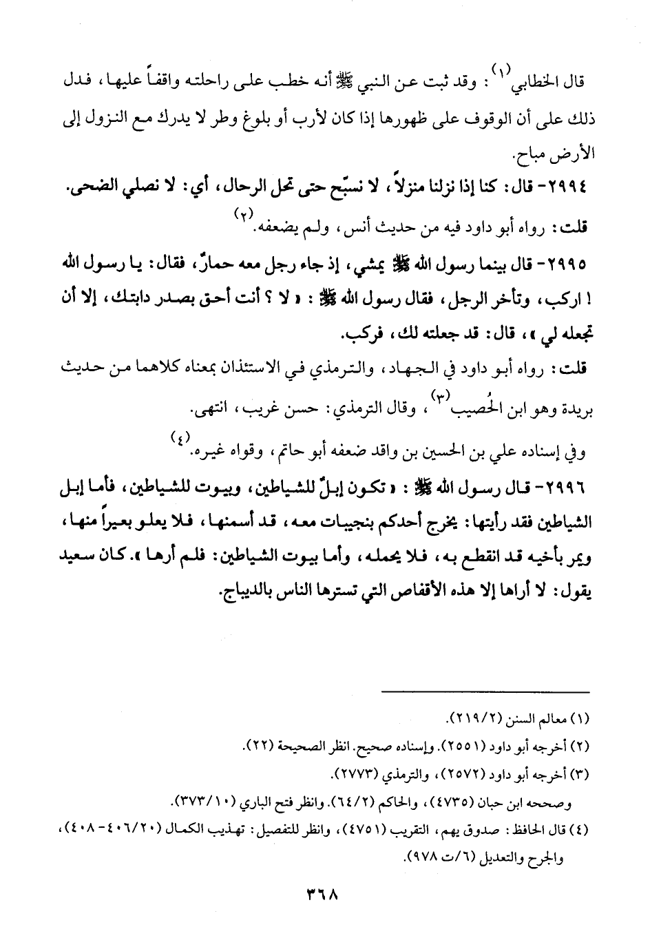 2994 - قال: كنا إذا نزلنا منزلًا، لا نسبّح حتى تحل الرحال، أي: لا نصلي الضحى.
