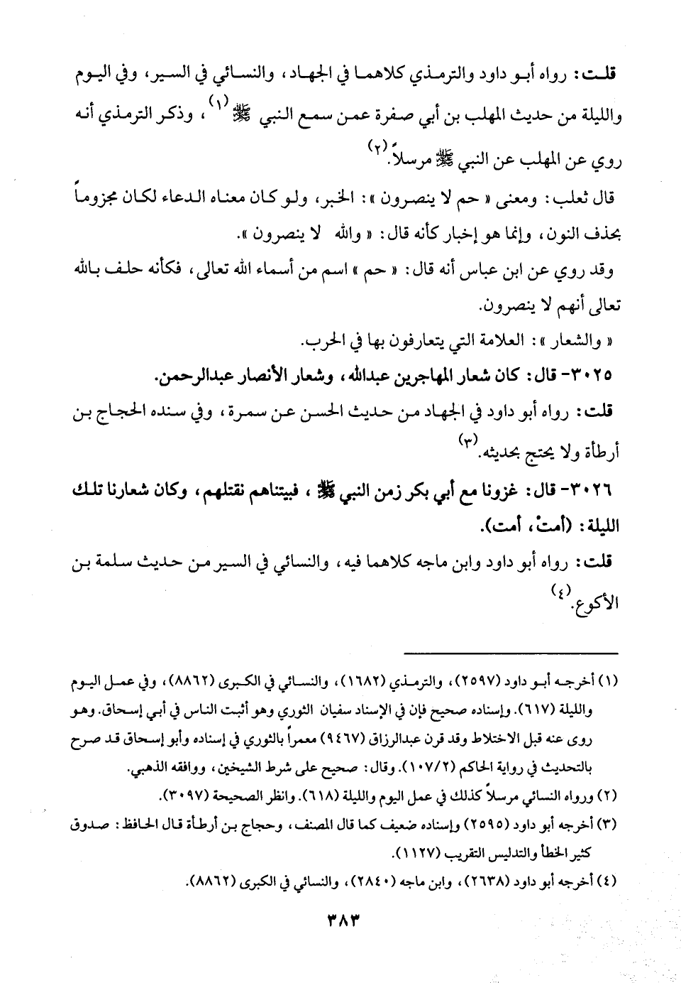 3025 - قال: كان شعار المهاجرين عبد الله، وشعار الأنصار عبد الرحمن.