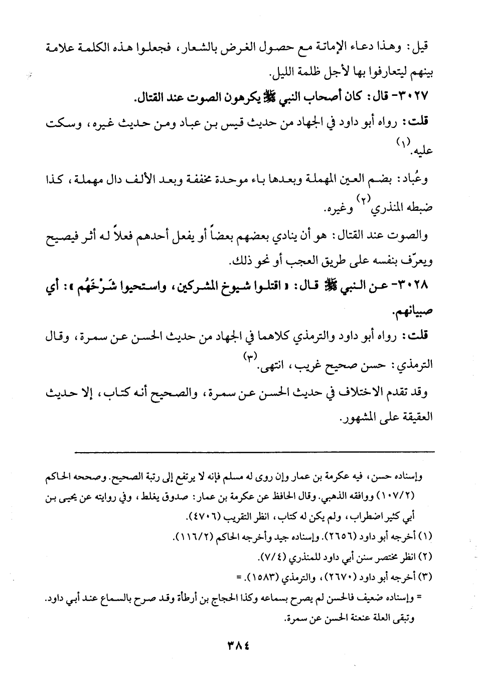 3027 - قال: كان أصحاب النبي - صلى الله عليه وسلم - يكرهون الصوت عند القتال.