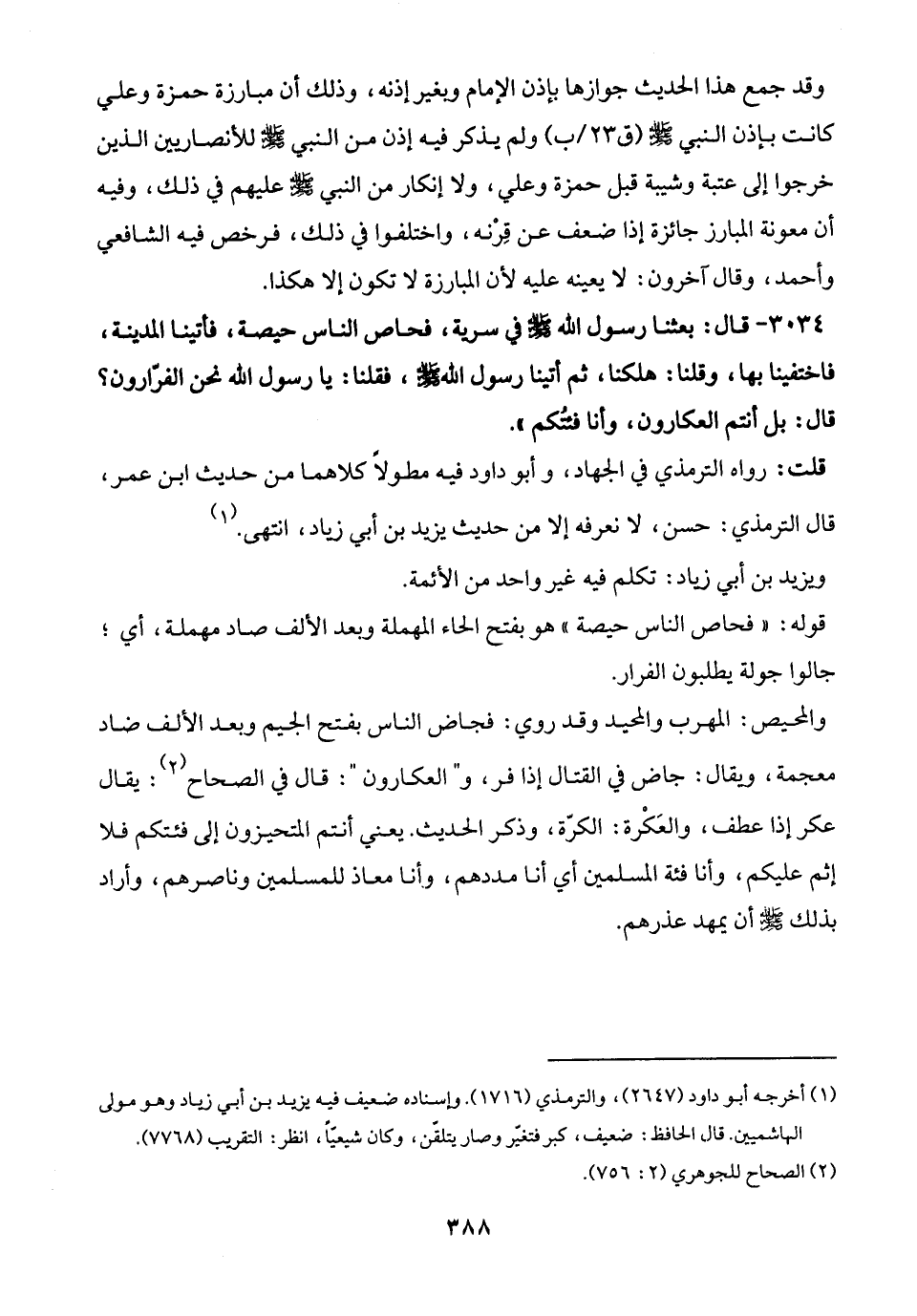 3034 - قال: بعثنا رسول الله - صلى الله عليه وسلم - في سرية، فحاص الناس حيصة، فأتينا المدينة، فاختفينا بها، وقلنا: هلكنا، ثم أتينا رسول الله - صلى الله عليه وسلم -، فقلنا: يا رسول الله - صلى الله عليه وسلم - نحن الفرّارون؟ قال: بل أنتم العكارون، وأنا فئتُكم".