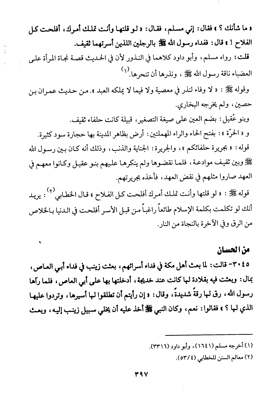 قلت: رواه مسلم، وأبو داود كلاهما في النذور لأن في الحديث قصة نجاة المرأة على العضباء ناقة رسول الله - صلى الله عليه وسلم -، ونذرها أن تنحرها. (¬1)