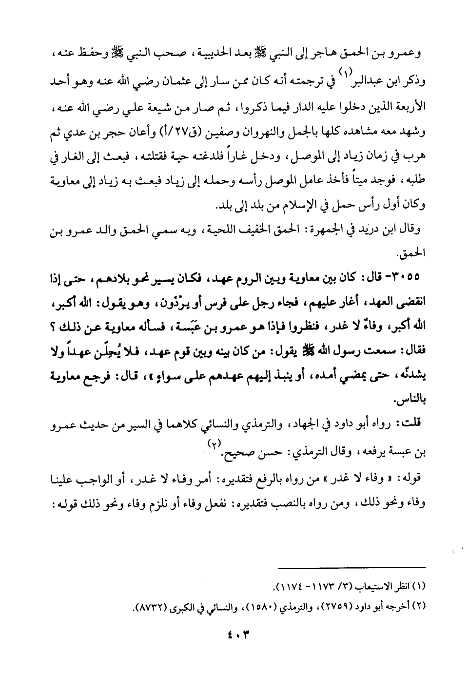 3055 - قال: كان بين معاوية وبين الروم عهد، فكان يسير نحو بلادهم، حتى إذا انقضى العهد، أغار عليهم، فجاء رجل على فرس أو بِرْذَون، وهو يقول: الله أكبر، الله أكبر، وفاءٌ لا غدر، فنظروا فإذا هو عمرو بن عَبَسة، فسأله معاوية عن ذلك؟ فقال: سمعت رسول الله - صلى الله عليه وسلم - يقول: من كان بينه وبين قوم عهد، فلا يُحِلن عهدًا ولا يشدنّه، حتى يمضي أمده، أو ينبذ إليهم عهدهم على سواءٍ"، قال: فرجع معاوية بالناس.