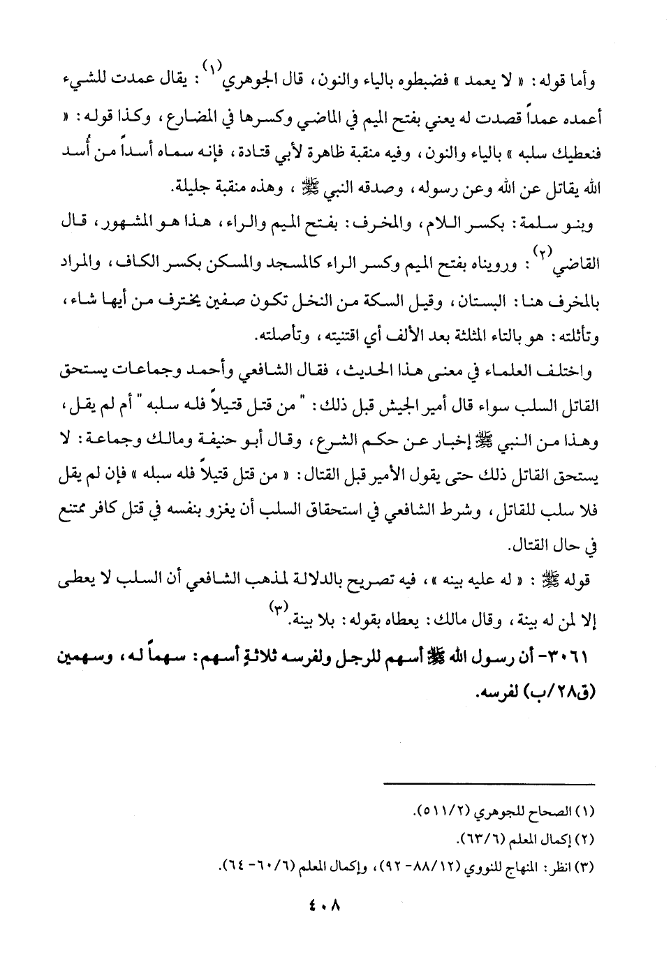 3061 - أن رسول الله - صلى الله عليه وسلم - أسهم للرجل ولفرسه ثلاثةٍ أسهم: سهمًا له، وسهمين لفرسه.