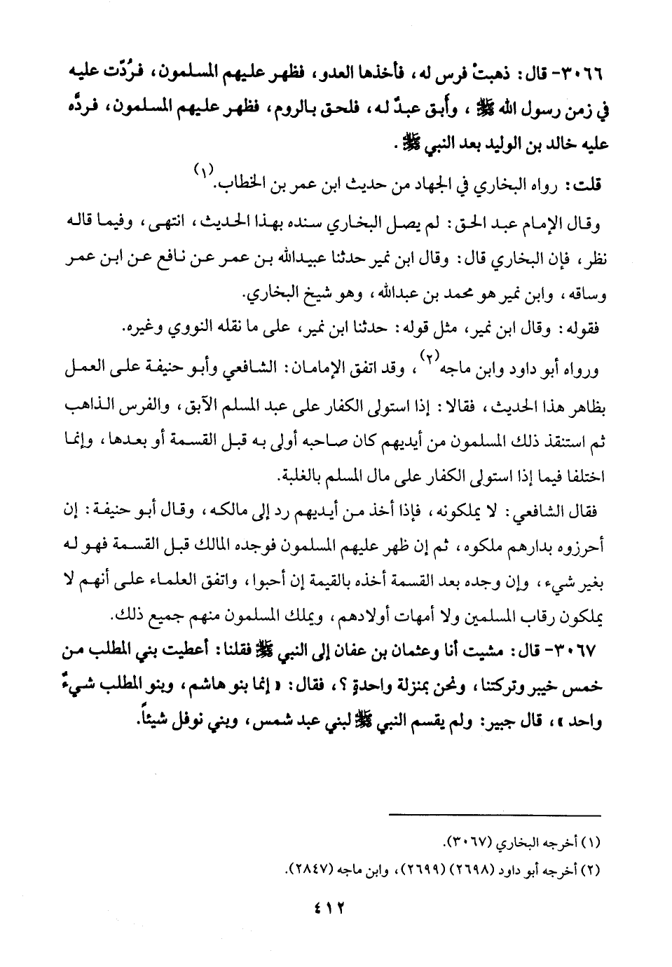 3066 - قال: ذهبتْ فرس له، فأخذها العدو، فظهر عليهم المسلمون، فرُدّت عليه في زمن رسول الله - صلى الله عليه وسلم -، وأَبق عبدٌ له، فلحق بالروم، فظهر عليهم المسلمون، فردَّه عليه خالد بن الوليد بعد النبي - صلى الله عليه وسلم -.