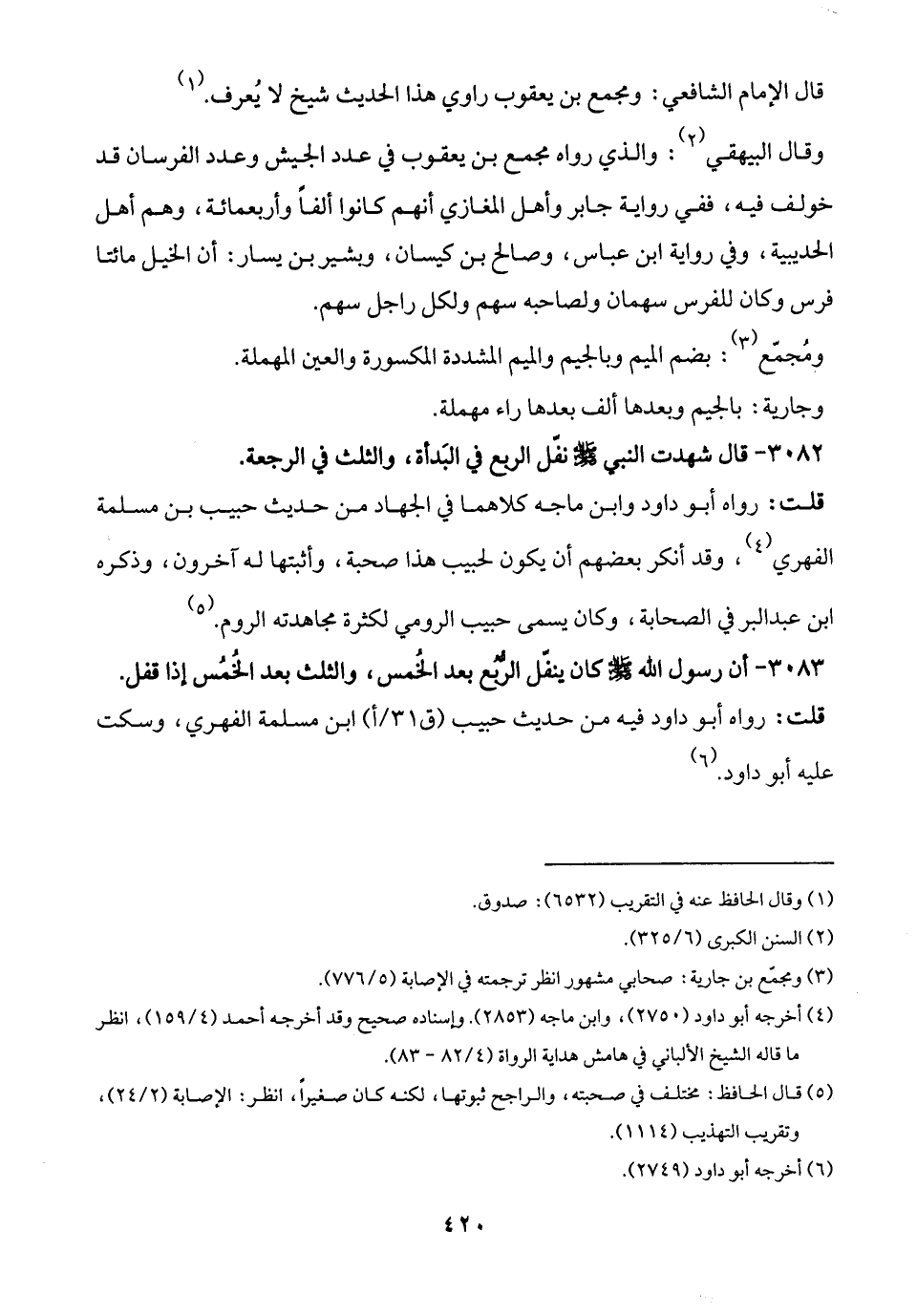 3082 - قال شهدت النبي - صلى الله عليه وسلم - نفّل الربع في البَدأة، والثلث في الرجعة.