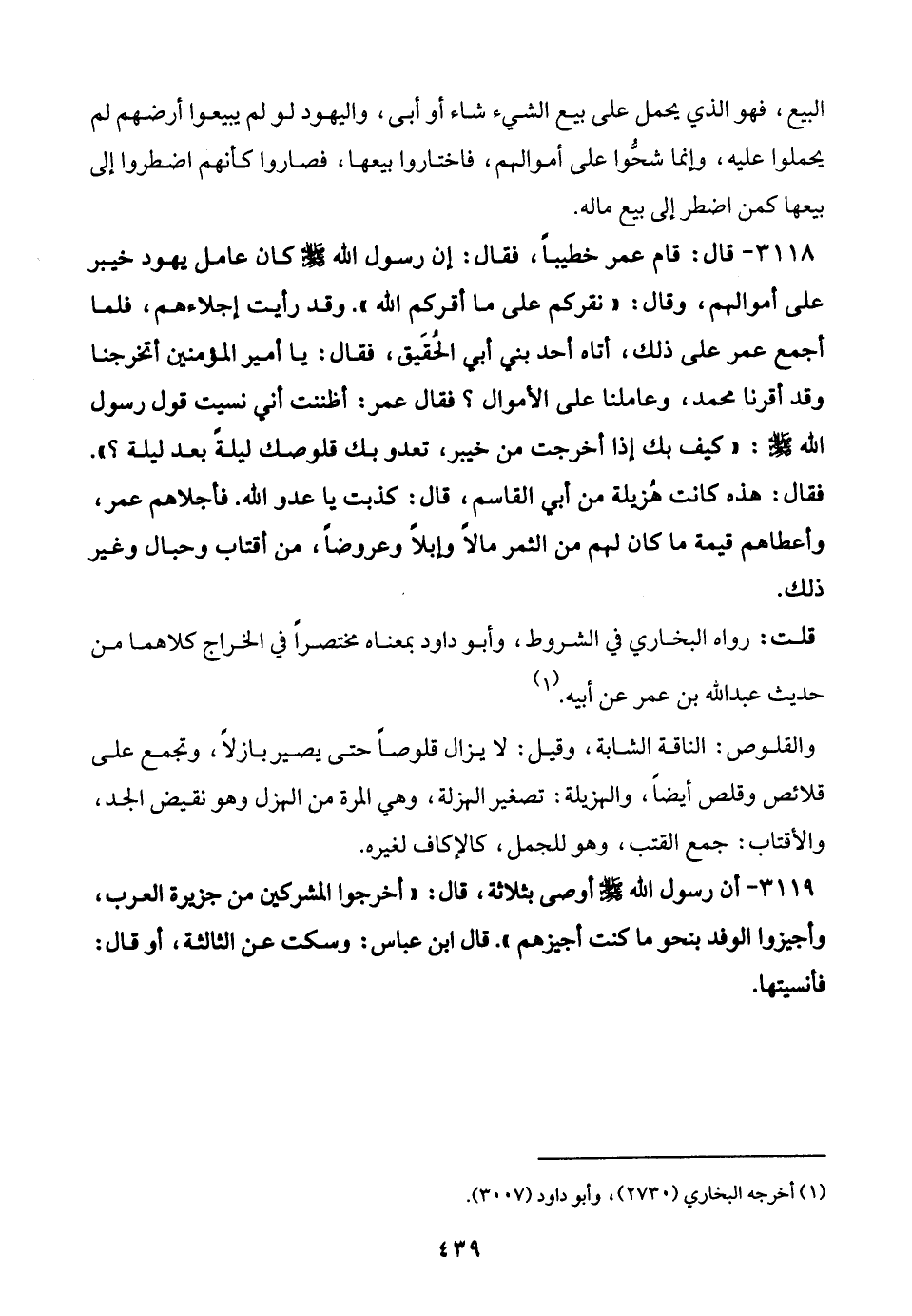 3118 - قال: قام عمر خطيبًا، فقال: إن رسول الله - صلى الله عليه وسلم - كان عامل يهود خيبر على أموالهم، وقال: "نقركم على ما أقركم الله". وقد رأيت إجلاءهم، فلما أجمع عمر على ذلك، أتاه أحد بني أبي الحُقَيق، فقال: يا أمير المؤمنين أتخرجنا وقد أقرنا محمد، وعاملنا على الأموال؟ فقال عمر: أظننت أني نسيت قول رسول الله - صلى الله عليه وسلم -: "كيف بك إذا أخرجت من خيبر، تعدو بك قلوصك ليلةً بعد ليلة؟ ". فقال: هذه كانت هُزيلة من أبي القاسم، قال: كذبت يا عدو الله. فأجلاهم عمر، وأعطاهم قيمة ما كان لهم من الثمر مالًا وإبلًا وعروضًا، من أقتاب وحبال وغير ذلك.