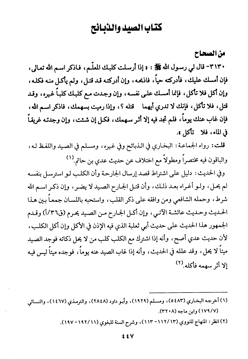 3130 - قال لي رسول الله - صلى الله عليه وسلم -: "إذا أرسلت كلبك المعلّم، فاذكر اسم الله تعالى، فإن أمسك عليك، فأدركته حيًّا، فاذبحه، وإن أدركته قد قتل، ولم يأكل منه فكله، وإن أكل فلا تأكل، فإنما أمسك على نفسه، وإن وجدت مع كلبك كلبًا غيره، وقد قتل، فلا تأكل، فإنك لا تدري أيهما قتله؟، وإذا رميت بسهمك، فاذكر اسم الله، فإن غاب عنك يومًا، فلم تجد فيه إلا أثر سهمك، فكل إن شئت، وإن وجدته غريقًا في الماء، فلا تأكل".
