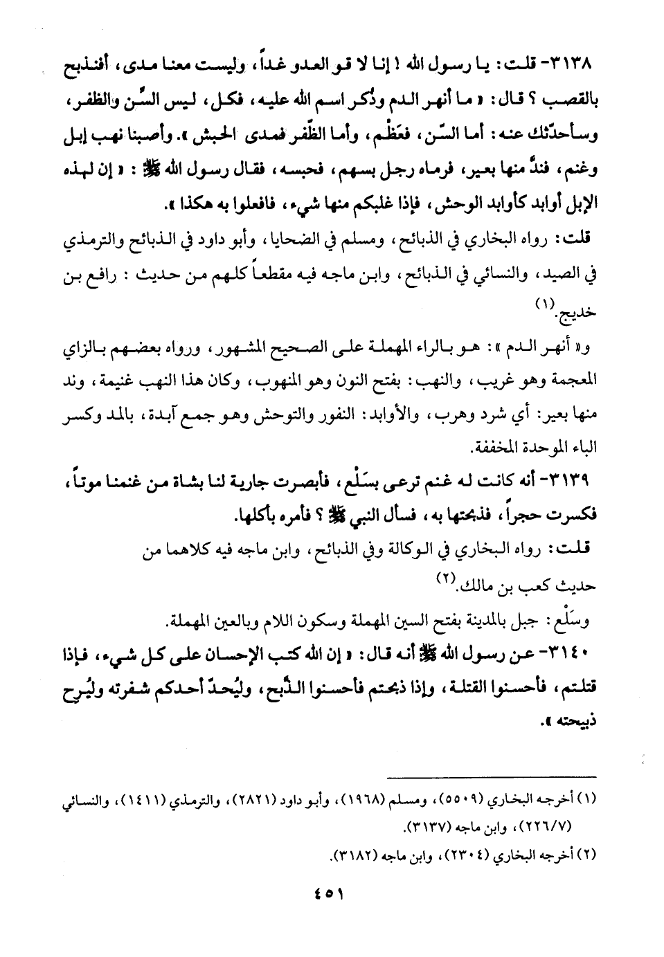 3139 - أنه كانت له غنم ترعى بسَلْع، فأبصرت جارية لنا بشاة من غنمنا موتًا، فكسرت حجرًا، فذبحتها به، فسأل النبي - صلى الله عليه وسلم -؟ فأمره بأكلها.
