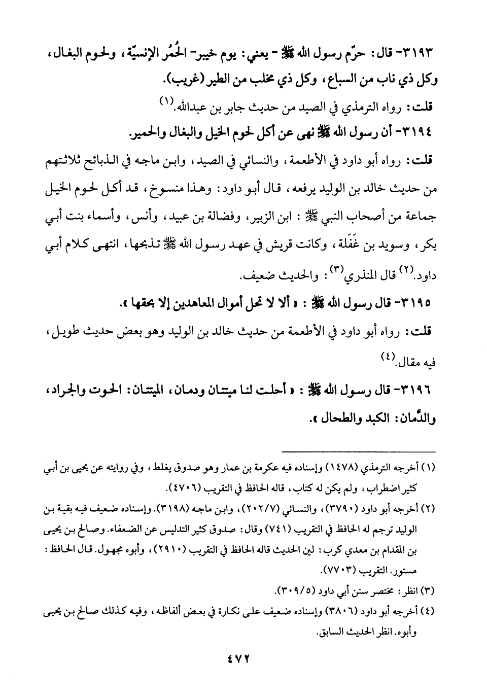 قلت: رواه أبو داود في الأطعمة، والنسائي في الصيد، وابن ماجه في الذبائح ثلاثتهم من حديث خالد بن الوليد يرفعه، قال أبو داود: وهذا منسوخ، قد أكل لحوم الخيل جماعة من أصحاب النبي - صلى الله عليه وسلم -: ابن الزبير، وفضالة بن عبيد، وأنس، وأسماء بنت أبي بكر، وسويد بن غَفَلة، وكانت قريش في عهد رسول الله - صلى الله عليه وسلم - تذبحها، انتهى كلام أبي داود. (¬2) قال المنذري (¬3): والحديث ضعيف.
