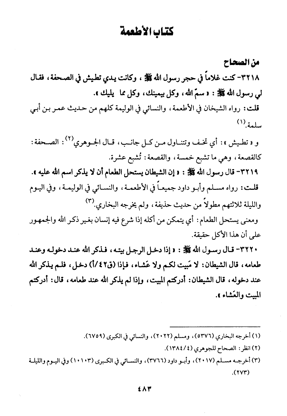 3218 - كنت غلامًا في حجر رسول الله - صلى الله عليه وسلم -، وكانت يدي تطيش في الصحفة، فقال لي رسول الله - صلى الله عليه وسلم -: "سمّ الله، وكل بيمينك، وكل مما يليك".