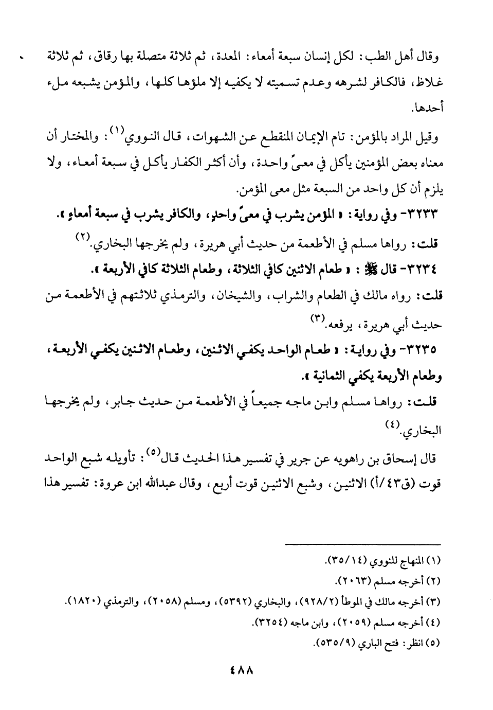 3233 - وفي رواية: "المؤمن يشرب في معيً واحدٍ، والكافر يشرب في سبعة أمعاءٍ".