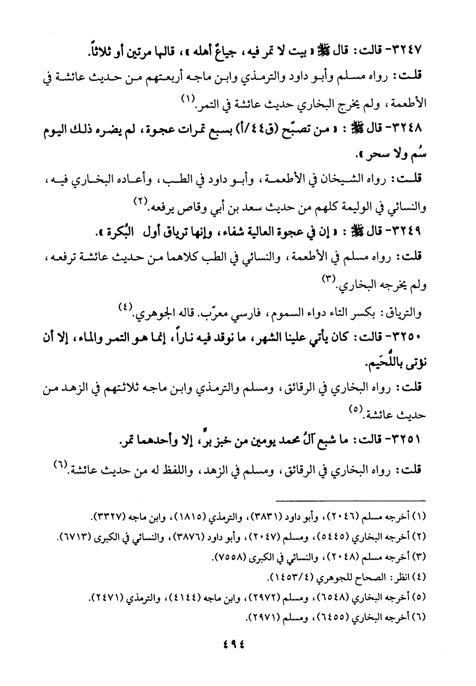 قلت: رواه مسلم وأبو داود والترمذي وابن ماجه أربعتهم من حديث عائشة في الأطعمة، ولم يخرج البخاري حديث عائشة في التمر. (¬1)
