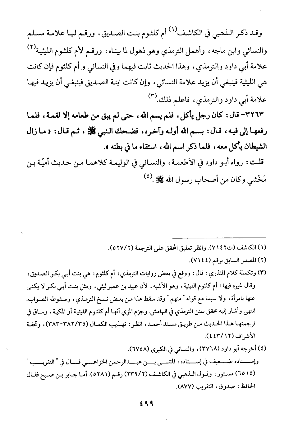 وقد ذكر الذهبي في الكاشف (¬1) أم كلثوم بنت الصديق، ورقم لها علامة مسلم والنسائي وابن ماجه، وأهمل الترمذي وهو ذهول لما بيناه، ورقم لأم كلثوم الليثية (¬2) علامة أبي داود والترمذي، وهذا الحديث ثابت فيهما وفي النسائي وأم كلثوم فإن كانت هي الليثية فينبغي أن يزيد علامة النسائي، وإن كانت ابنة الصديق فينبغي أن يزيد فيها علامة أبي داود والترمذي، فاعلم ذلك. (¬3)