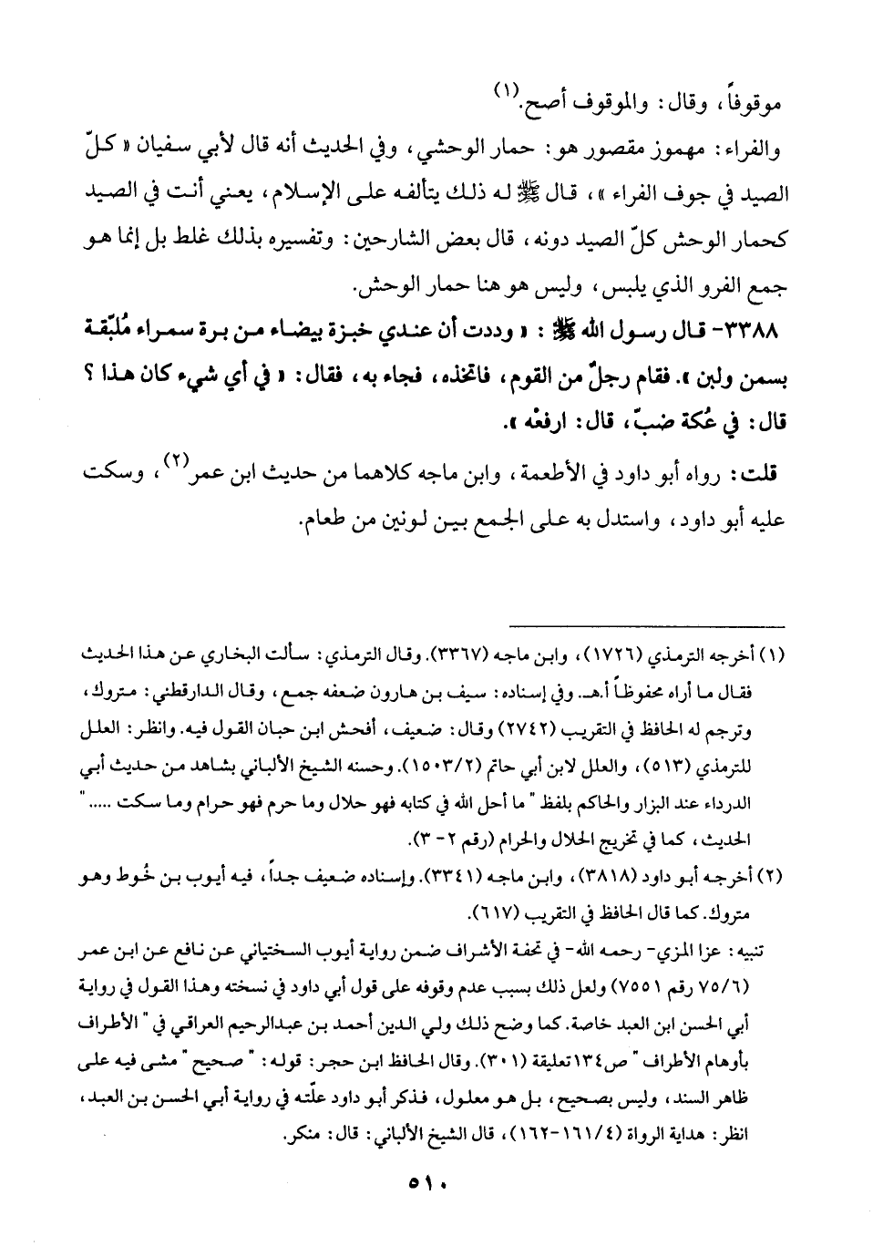 تنبيه: عزا المزي -رحمه الله- في تحفة الأشراف ضمن رواية أيوب السختياني عن نافع عن ابن عمر (6/ 75 رقم 7551) ولعل ذلك بسبب عدم وقوفه على قول أبي داود في نسخته وهذا القول في رواية أبي الحسن ابن العبد خاصة. كما وضح ذلك ولي الدين أحمد بن عبد الرحيم العراقي في "الأطراف بأوهام الأطراف" ص 134 تعليقة (301). وقال الحافظ ابن حجر: قوله: "صحيح" مشى فيه على ظاهر السند، وليس بصحيح، بل هو معلول، فذكر أبو داود علّته في رواية أبي الحسن بن العبد، انظر: هداية الرواة (4/ 161 - 162)، قال الشيخ الألباني: قال: منكر.