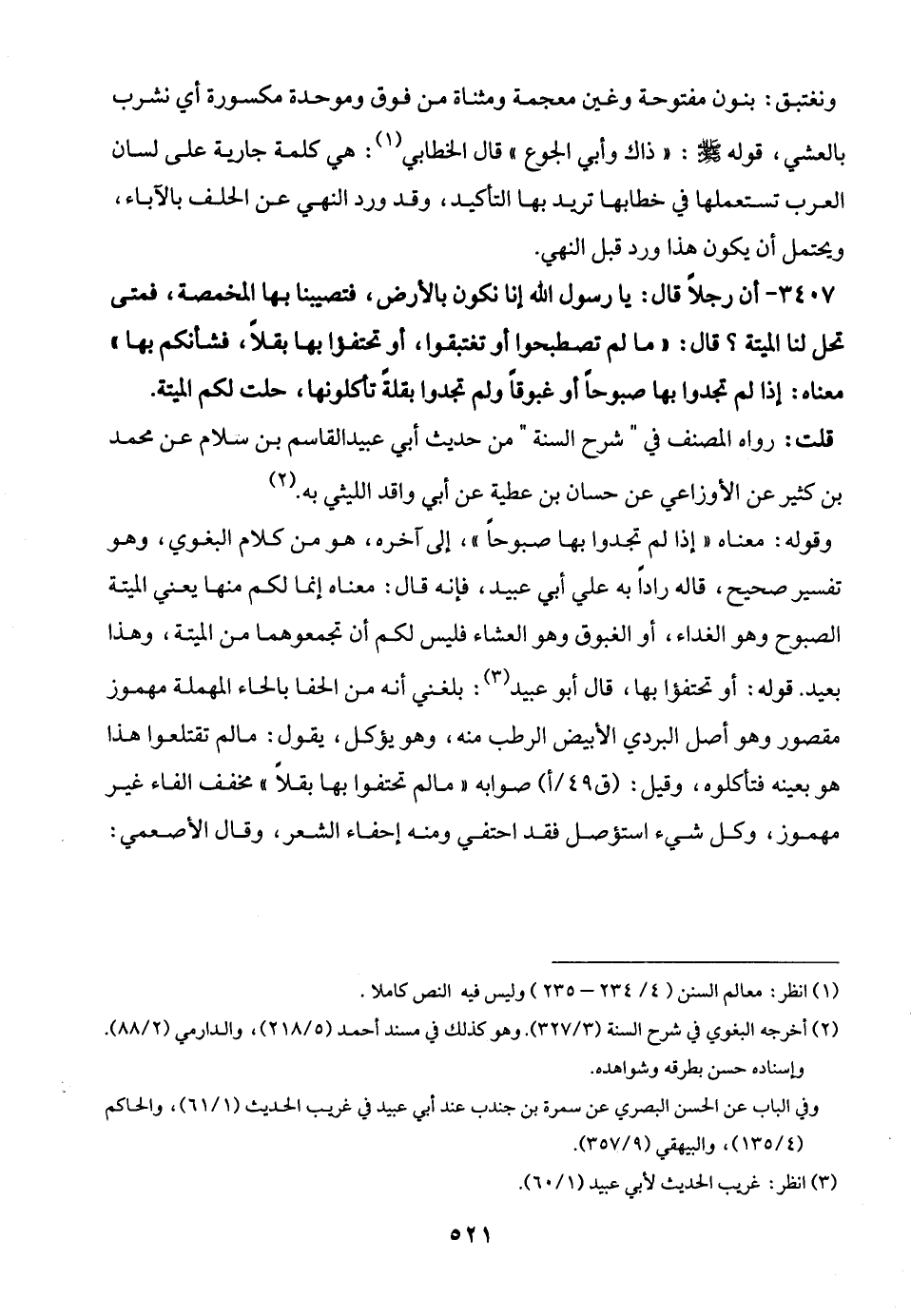 3407 - أن رجلًا قال: يا رسول الله إنا نكون بالأرض، فتصيبنا بها المخمصة، فمتى تحل لنا الميتة؟ قال: "ما لم تصطبحوا أو تغتبقوا، أو تحتفؤا بها بقلًا، فشأنكم بها" معناه: إذا لم تجدوا بها صبوحًا أو غبوقًا ولم تجدوا بقلةً تأكلونها، حلت لكم الميتة.