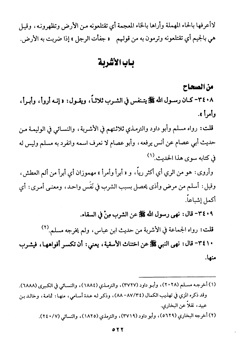 3410 - قال: نهى النبي - صلى الله عليه وسلم - عن اختناث الأسقية، يعني: أن تكسر أفواهها، فيشرب منها.